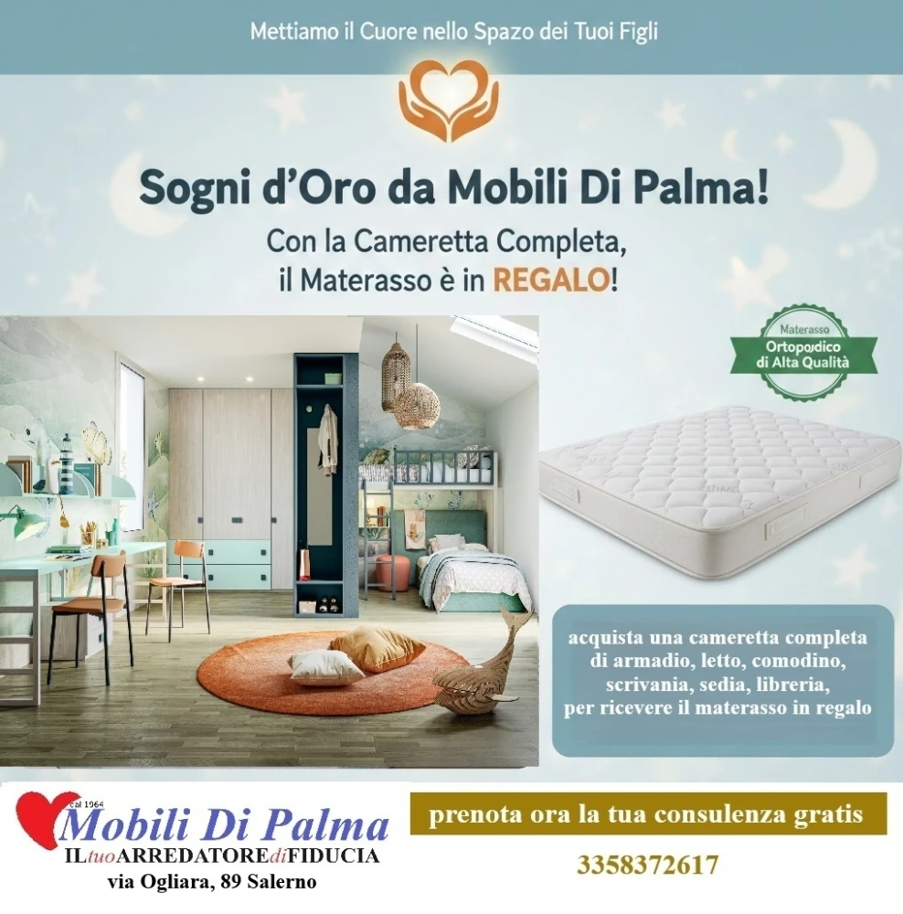 Cerchi camerette a Salerno? Scopri Mobili Di Palma! Soluzioni su misura, design e qualità per i tuoi figli. Solo questo mese: acquista una cameretta completa e il materasso te lo regaliamo noi! Vieni a trovarci in via Ogliara, 89 a Salerno.