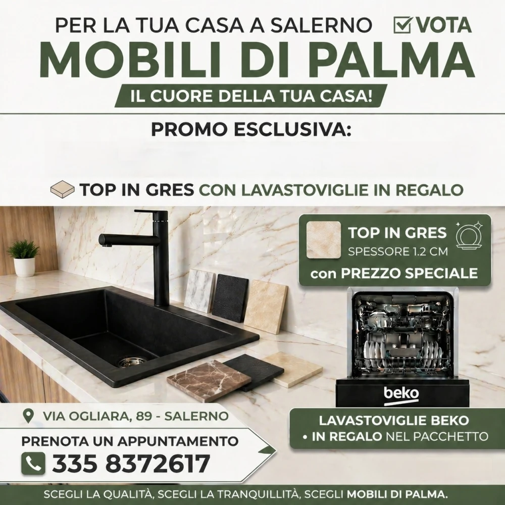 Mobili Di Palma propone soluzioni d’arredo per cucine di design di fascia medio-alta a costi accessibili, coniugando estetica e innovazione tecnica. La promozione attuale prevede l'integrazione di un top in gres H 1,2 cm a un prezzo specialissimo e il set Poker Beko con lavastoviglie in omaggio, garantendo un equipaggiamento tecnologico completo e di alta qualità.