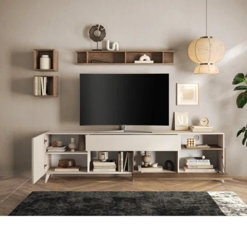 Mobili Multiuso e Contenitori: Ottimizza lo spazio con basi porta TV, librerie e vani chiusi dalle finiture materiche calde e moderne.