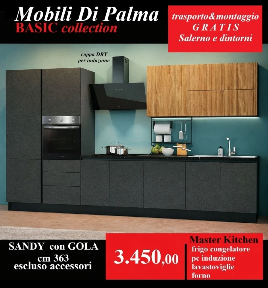 La cucina Basic Collection di Mobili Di Palma è pensata per chi cerca cucine componibili in promozione a Salerno e provincia, senza rinunciare a qualità, funzionalità e design. Si tratta di una composizione a schema fisso da 375 cm, solida e ben progettata, con ante ad apertura con gola e colori a scelta.