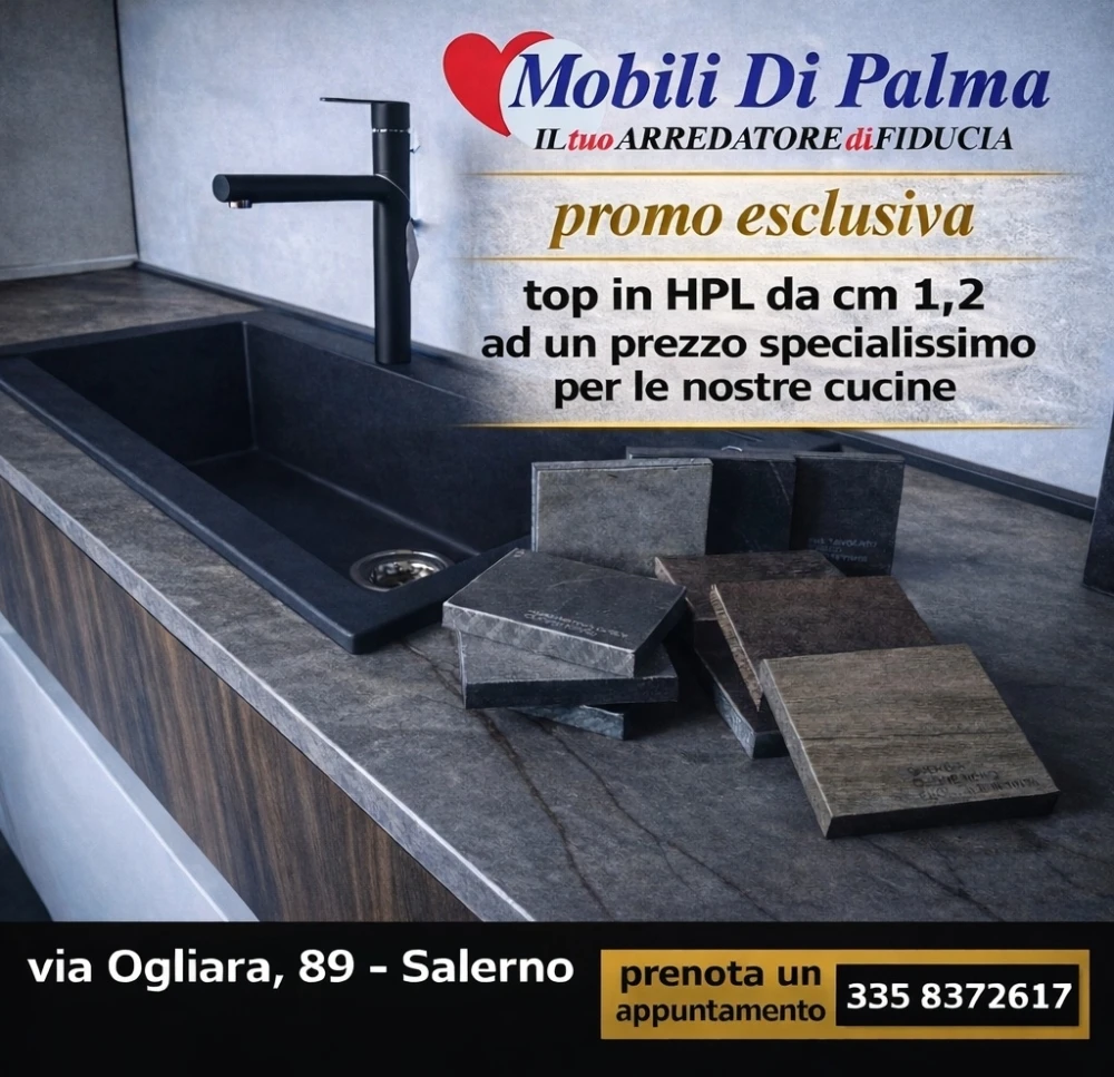 Acquista la tua cucina da Mobili Di Palma e approfitta della promozione esclusiva: ottieni il top in HPL 1,2 cm a un prezzo vantaggioso. Inoltre, con trasporto e montaggio gratuiti in Salerno e zone limitrofe, l’offerta diventa ancora più conveniente. Offriamo anche finanziamenti personalizzati direttamente in sede. Per un servizio ancora più rapido e su misura, ti consigliamo di fissare un appuntamento telefonico, così potrai ricevere una consulenza personalizzata e garantirti il miglior trattamento! Contattaci oggi per trasformare la tua cucina con qualità e senza pensieri.